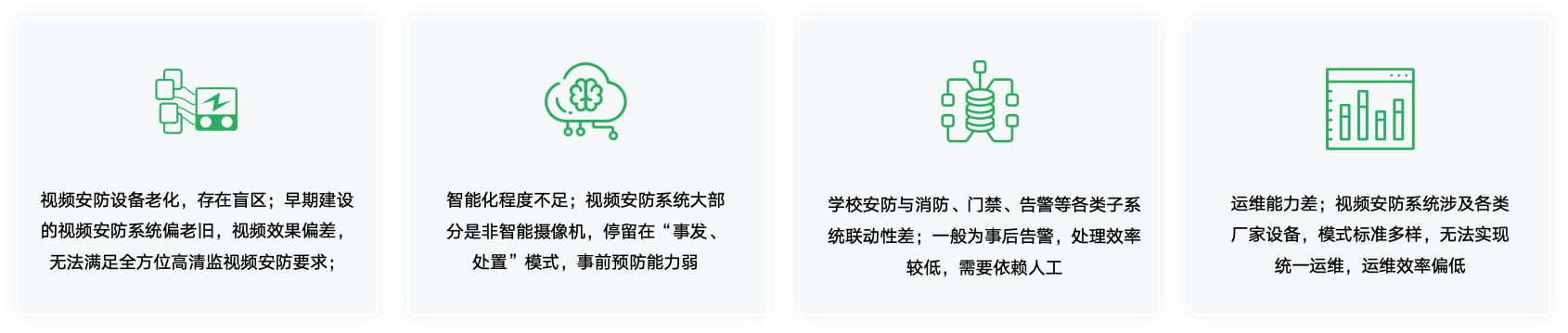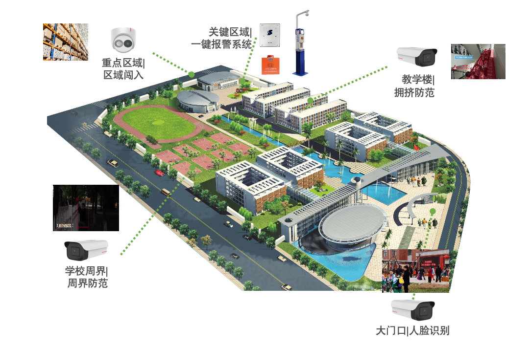 智能感知设施、一键报警系统、智能门禁系统、访客管理系统等构成校园安全防范模块。报警后可实现进行联动,同时向学校安全负责人和区域大数据指挥中心发送报警信息,并自动联动学校相关报警预案。
