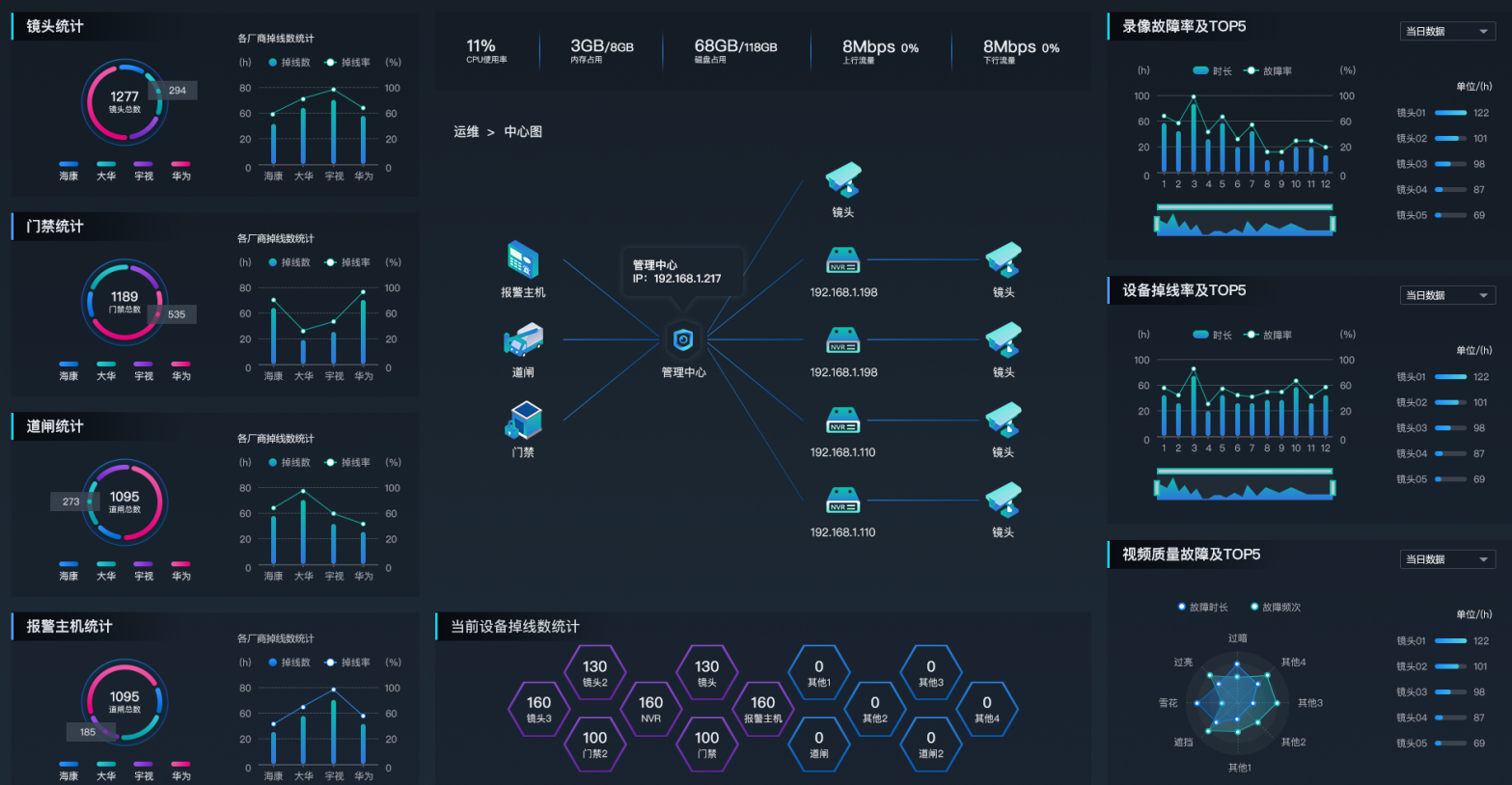 运维可视化实现全域资源状态可视化展示,提供平台运行监测、视频质量诊断、录像质量诊断、视频存储信息、运维报警等功能,提高运维人员工作效率,同时系统升级便捷