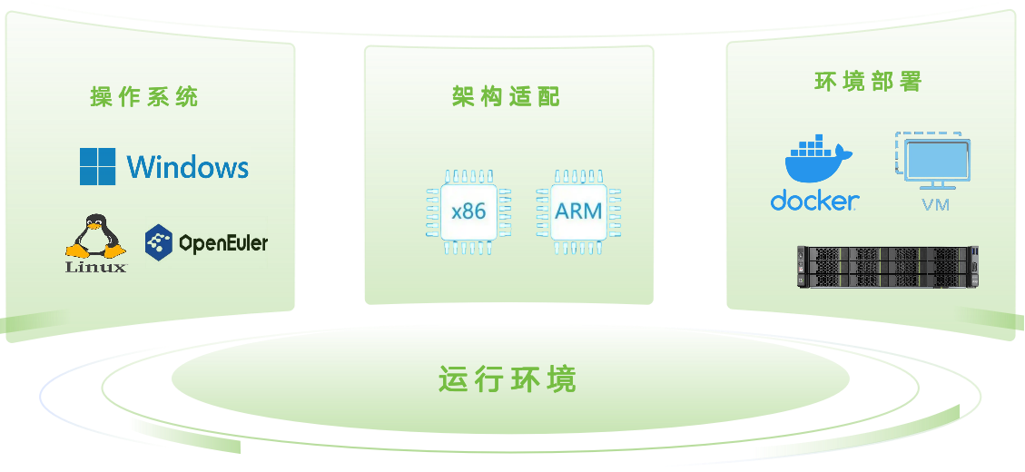 操作系统兼容Windows、Linux、统信UOS、OpenEuler、麒麟等;系统架构涵盖Intel x86、飞腾、龙芯、鲲鹏;灵活部署于VM、云端、服务器等多种环境。