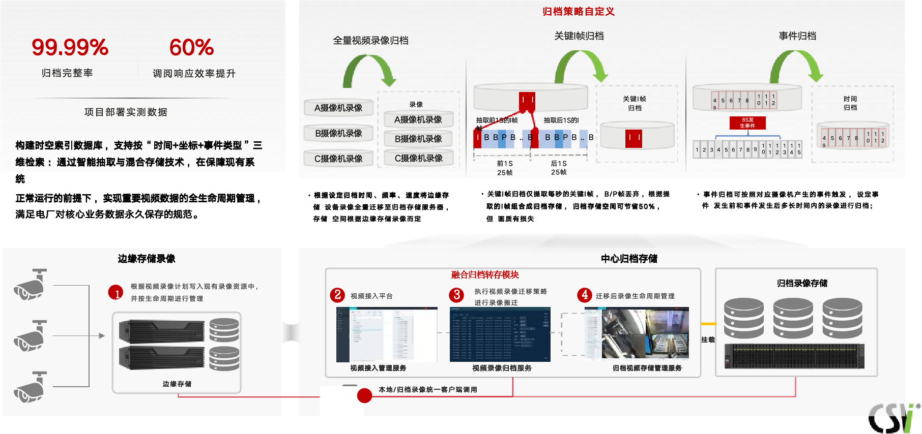 针对重要视频数据以及事件关联重要视频进行长期保存 , 系统基于当前视频监控系统架构 , 以多种归档策略 ,采用序列化归档+分级存储的技术路径 ,提供高性价比方案。