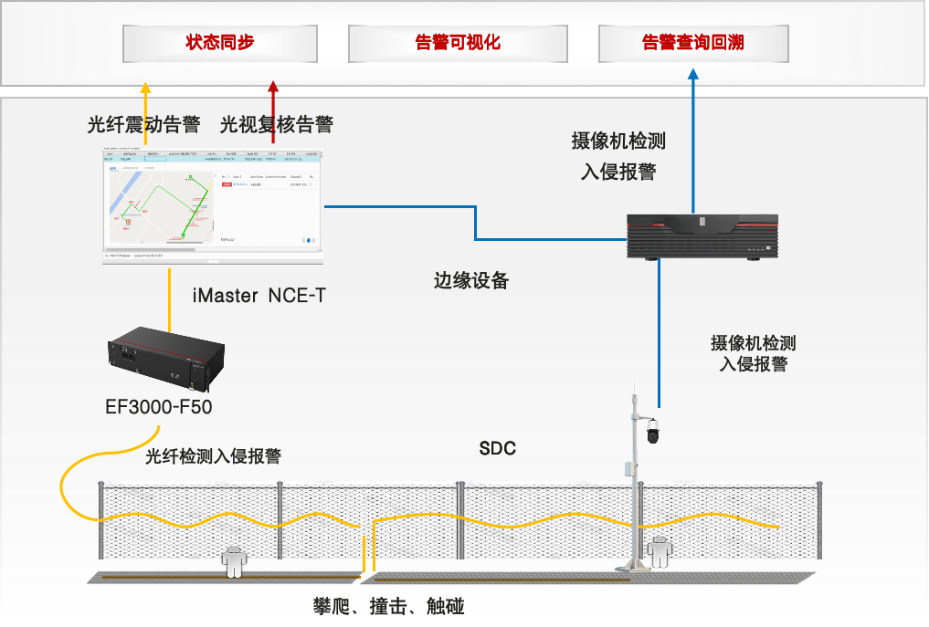 通过光纤振动传感器与智能摄像头联动,实现对攀爬、撞击等入侵行为的精准感知与智能复核。支持设备状态自动同步、报警地图可视化、光视告警联动与业务闭环处置,并提供多维度的告警查询回溯功能,为周界安全提供从实时预警、协同处置到全程可溯的智能化防范解决方案。