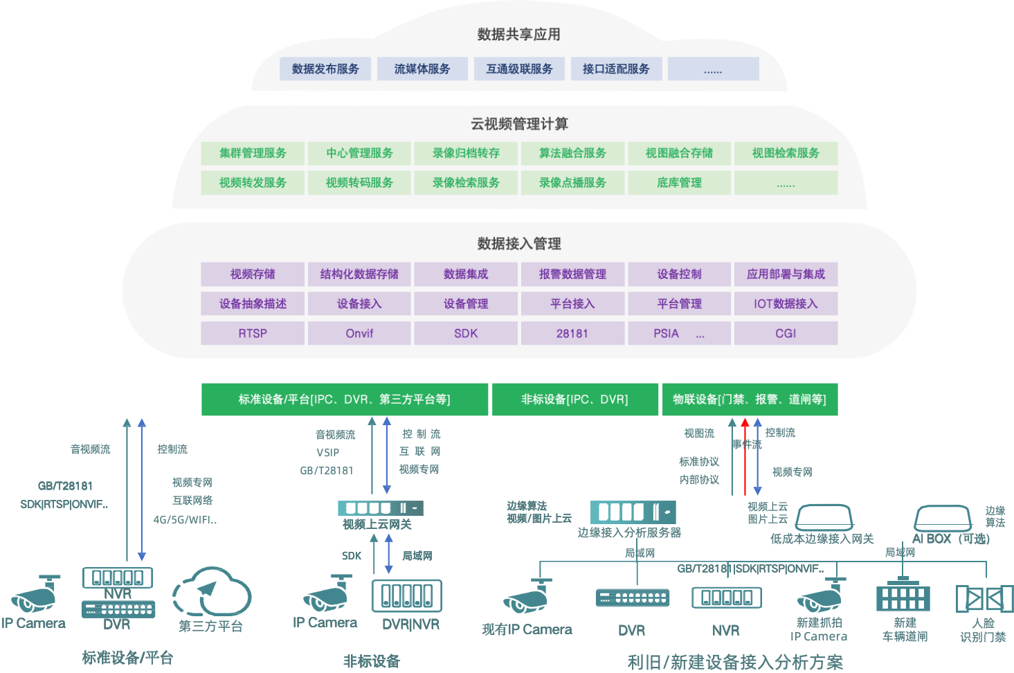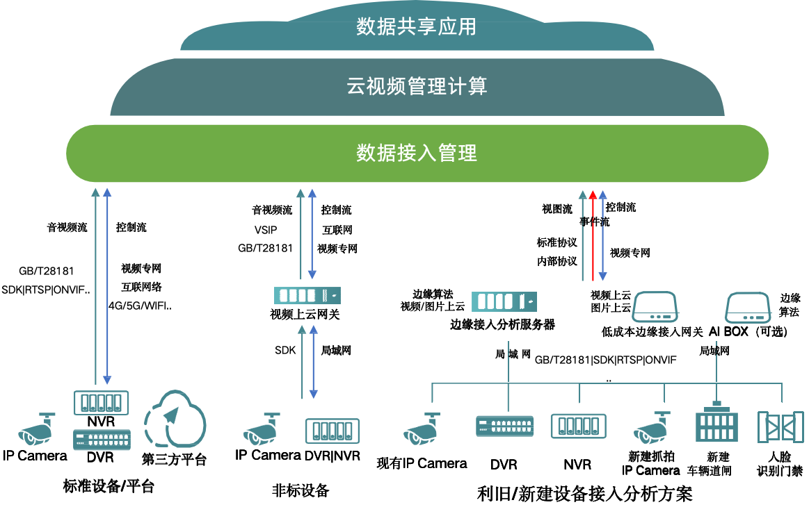 支持GB28181等多标准协议,兼容不同厂商、不同年代的视频设备,实现全域视频资源统一接入汇聚,降低设备适配与整合成本