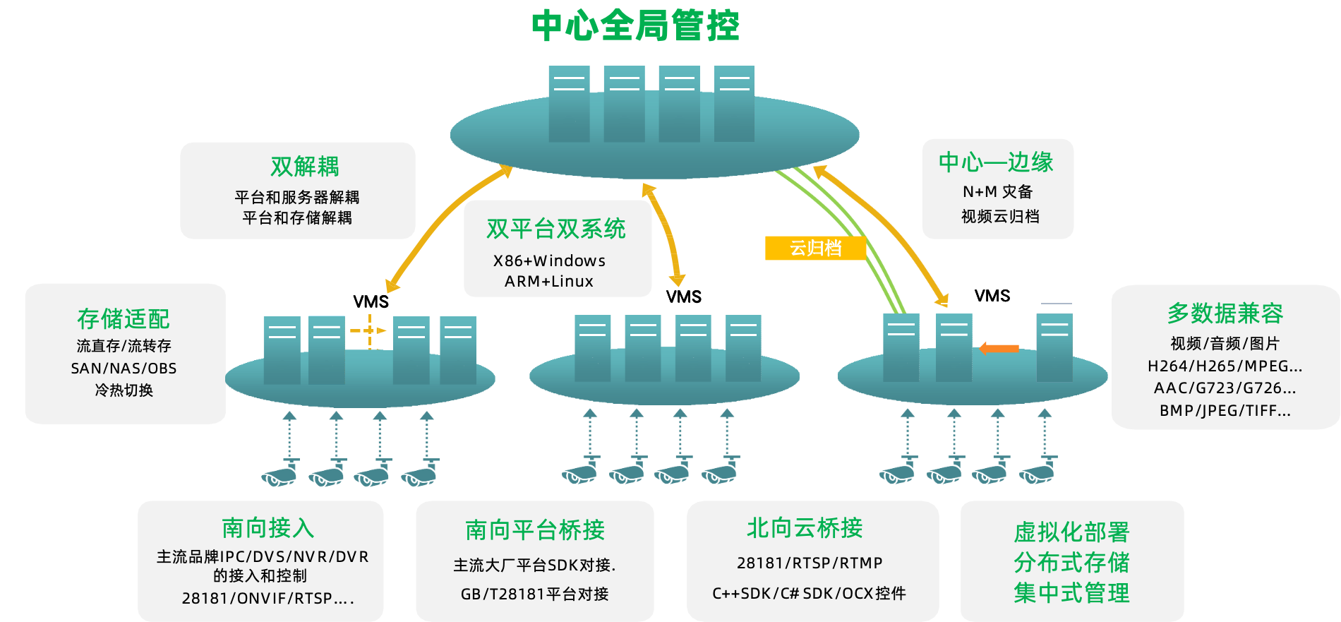 具备视频存储适配、视频云归档、N+M灾备等全栈能力,可处理海量视频数据并转化为结构化事件流,支撑多场景智能应用